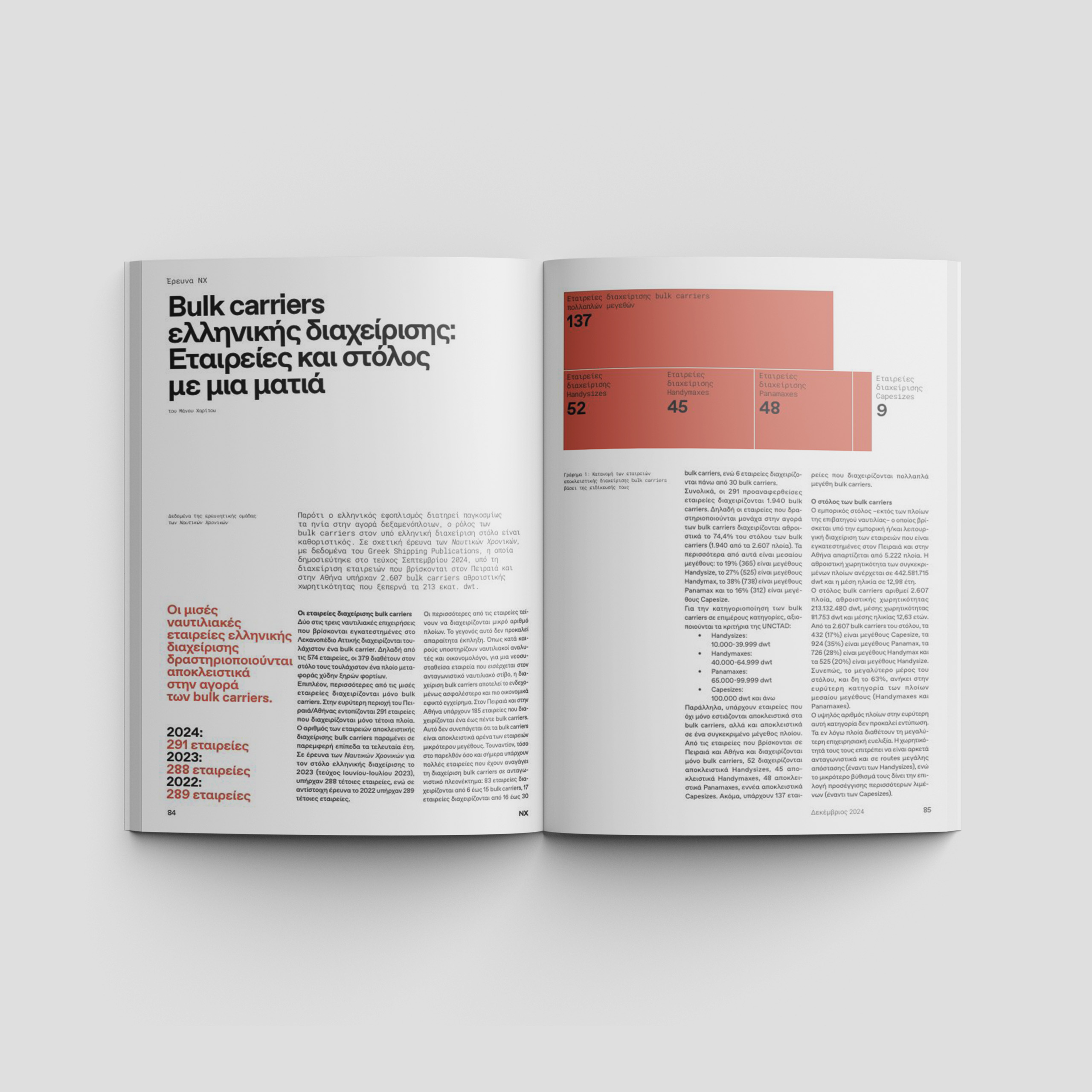 Ακολουθούν έρευνες και αναλύσεις δεδομένων για την ανάπτυξη του ελληνόκτητου και παγκόσμιου στόλου των bulk carriers. Επιπροσθέτως, έμπειροι αναλυτές της αγοράς καταθέτουν τις απόψεις τους για την πορεία των ναυλαγορών από την πλευρά της προσφοράς και της ζήτησης.
